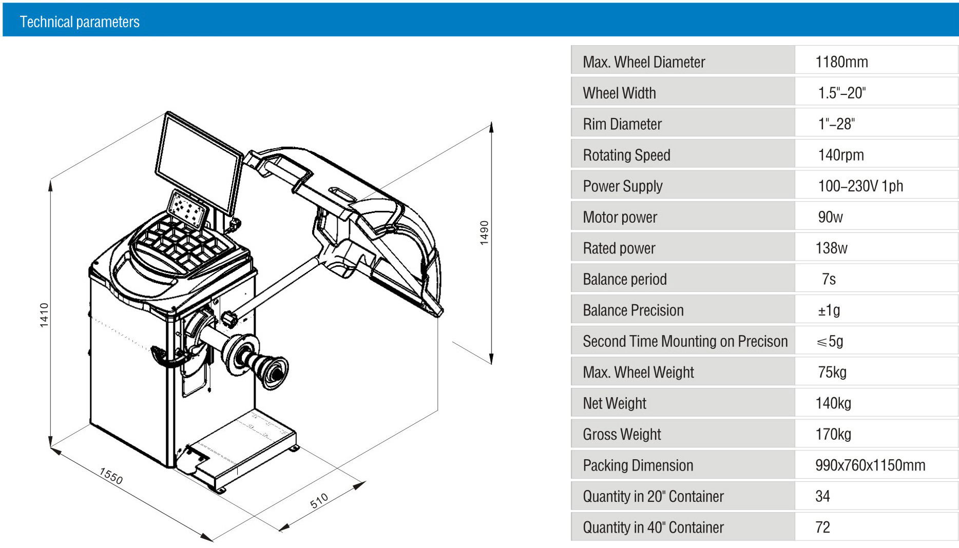 Технические данные балансера колеса LCD: