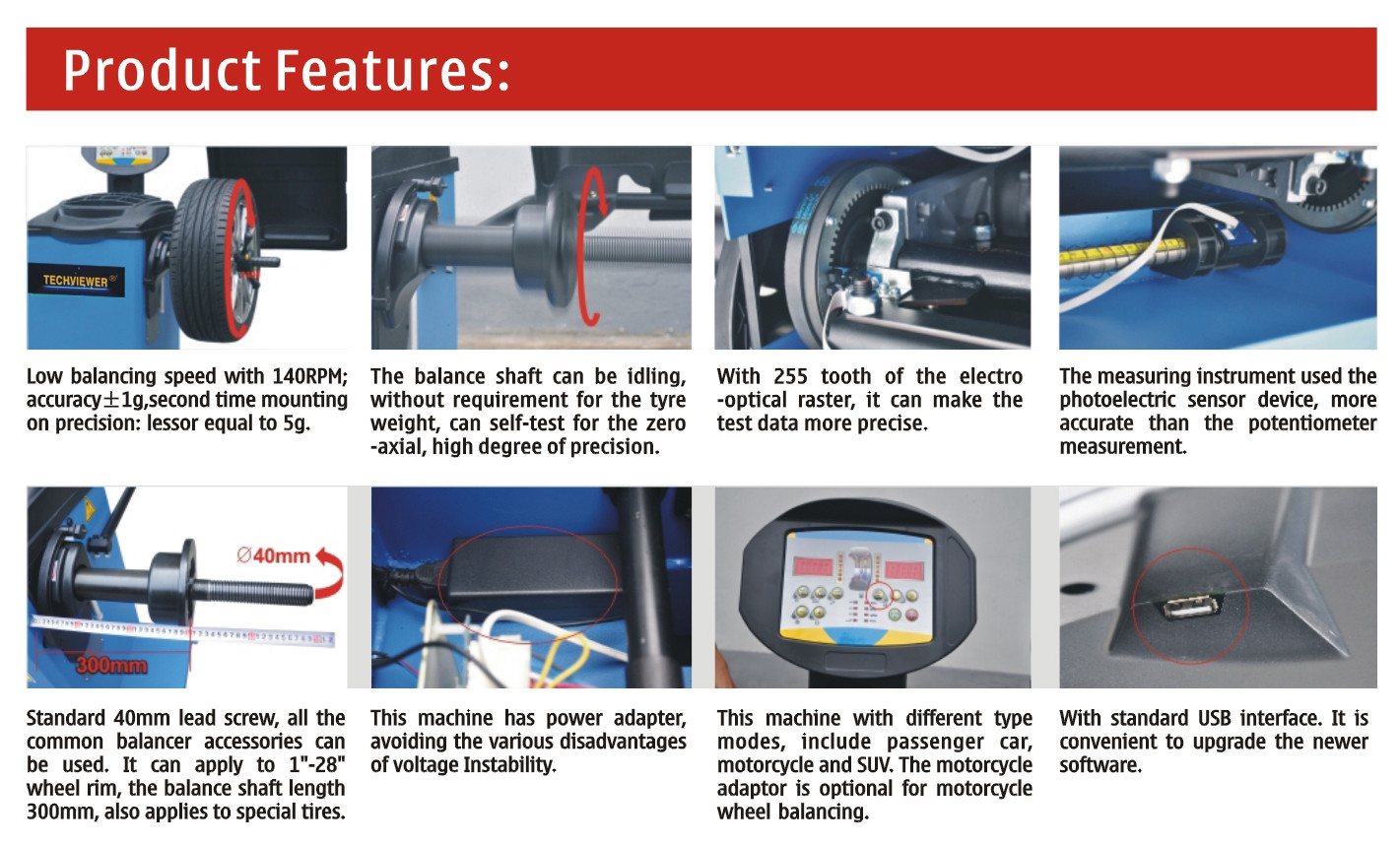 6. Вал баланса может iding, без требования для веса покрышки, само-тест для нул-осевого, высокая степень консервной банки точности.